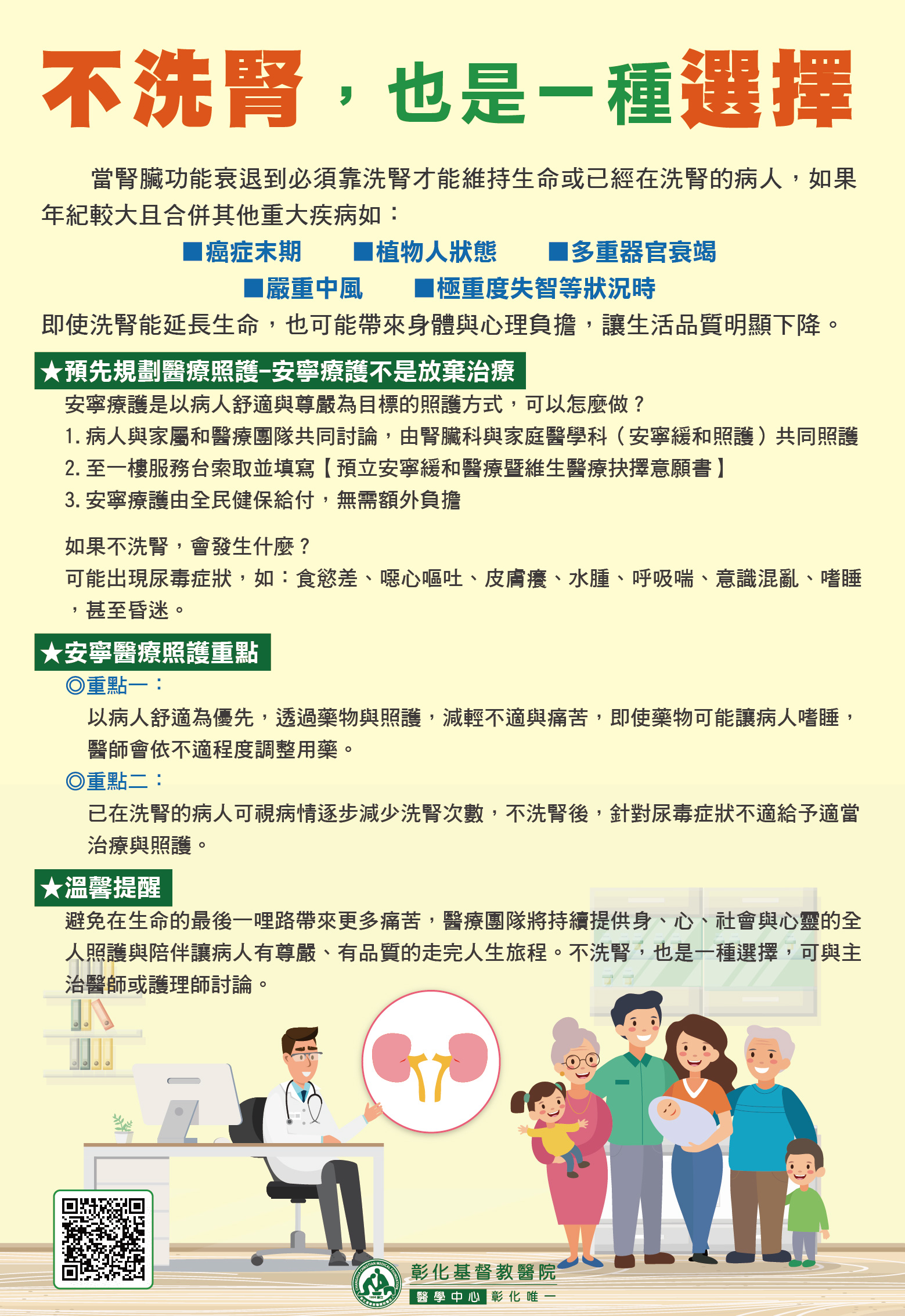 當腎臟功能嚴重衰退,必須依賴洗腎維持生命,或已在洗腎的病人,若年紀較大且合併重大疾病,即使洗腎能延長生命,也可能帶來身體與心理的負擔,使生活品質明顯下降。