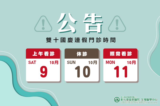 雙十國慶門診時間:10/9(六)8:00~12:00 / 10/11(一)......