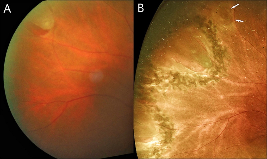 *圖A有1個裂孔,經雷射治療後,仍有新的裂孔出現。,如圖B箭頭處