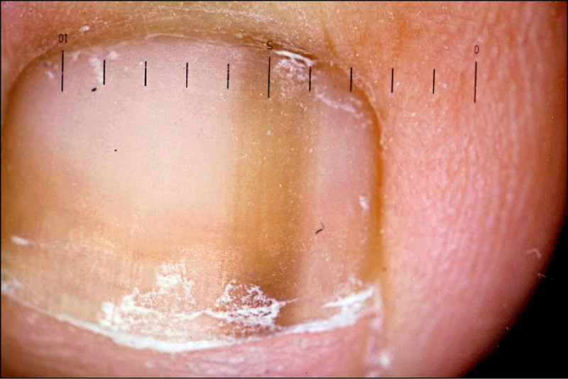 ●藥物引起:最常見的是化療藥物引起,其他藥物如奎寧、促腎上腺皮質激素等也會,通常會多個指甲受到侵犯,在停藥後則慢慢消退。