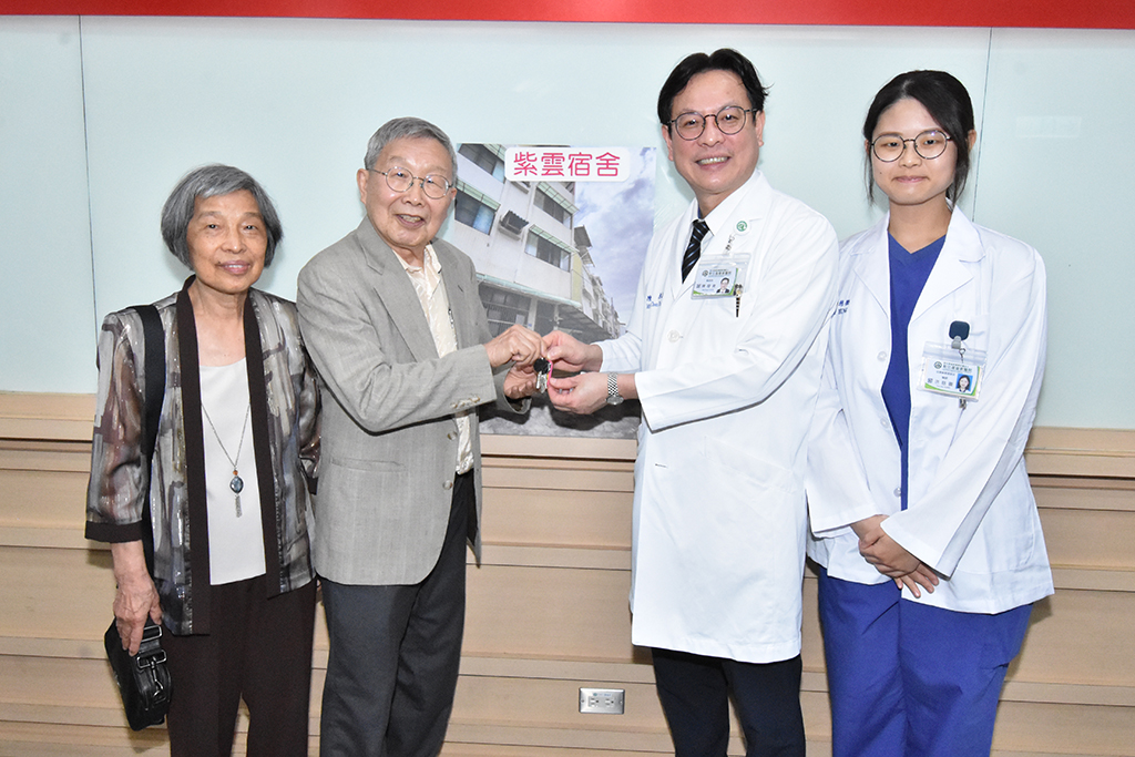 黃教授夫婦交付鑰匙,陳穆寬總院長(右二)、住院醫師洪慈徽(右一)代表彰基接受。