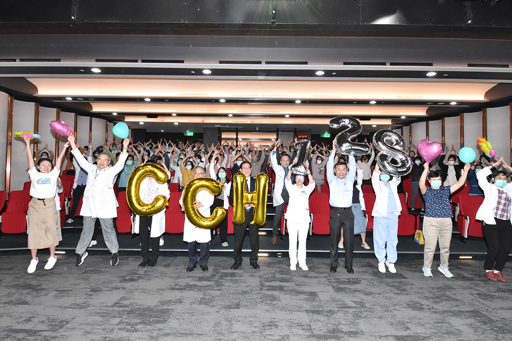彰基兒醫兒發中心帶動聽眾作健康操,手舞足蹈高喊「立足南校,翻轉難笑,百年彰基,充滿歡笑」口號。