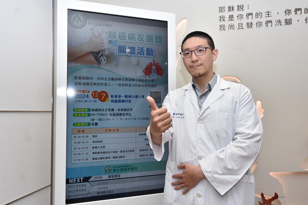彰基肺癌治療團隊召集人/胸腔外科醫師洪維亨表示,肺癌發生率越來越高,病友越來越多,彰基非常的用心安排肺癌病友關懷活動,介紹各種新知;此次病友關懷活動健康講座主題,分別是由胸腔內科呂俊佑醫師介紹最新標靶藥給付的條件,外科的部分則是由胸腔外科鄭雅夫醫師位介紹最新的消融技術,希望病友關懷活動能提供病友及家屬更多的新的治療選擇,如果還有任何問題,都可以到彰基胸腔內科及外科的門診接受諮詢。