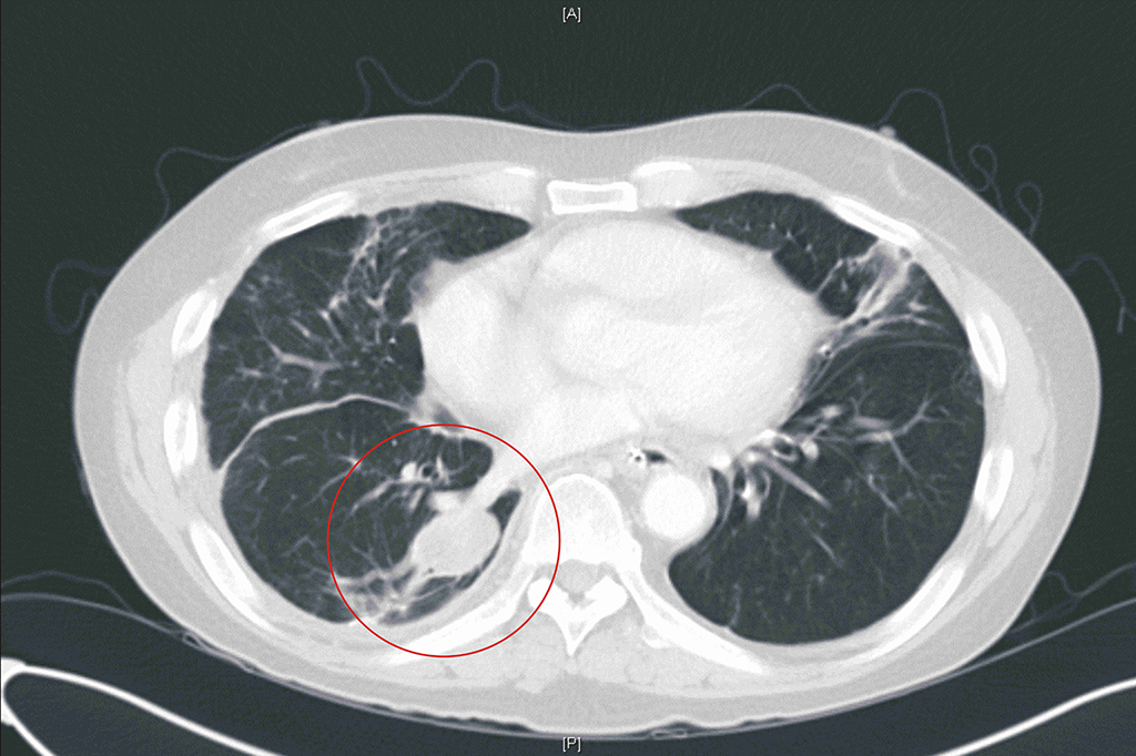 52歲男性患者,微波消融術前,右下肺一顆3公分腫瘤。