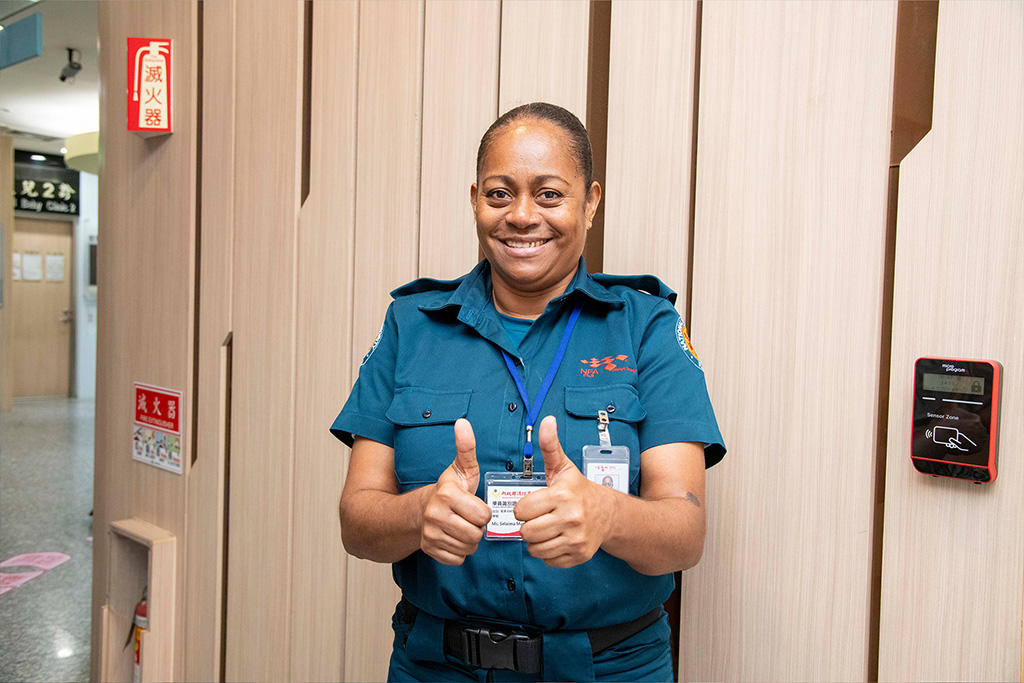 學員的組長 賽萊瑪(Selaima)女士表示來台灣學習EMT1(初級救護技術員)救護訓練獲益良多,肯定會將所學的技能回饋傳授給斐濟的救護學員。