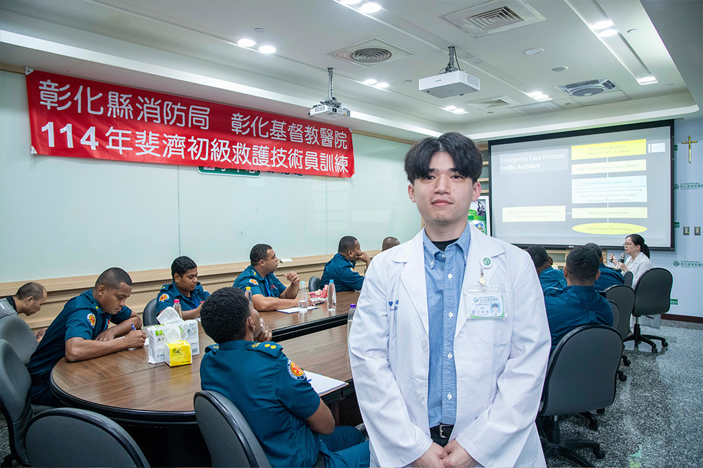 此次訓練由彰基急診團隊全程以英語授課,內容涵蓋到院前急救關鍵處置,包括車禍造成的骨折、頭頸胸腹部創傷、溺水、燒燙傷、低體溫、中暑、休克與中風等實務操作。透過模擬病人與實作教具,學員在演練中培養臨場應變能力,獲得紮實的臨床訓練體驗。
