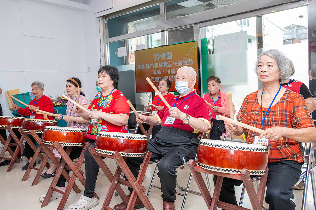 得憶園長者現場擊鼓演出,節奏穩健、神情專注,展現活力與團隊默契,氣氛熱烈、充滿生命力。