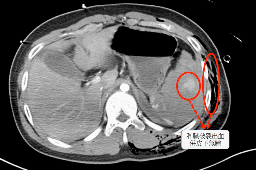經過電腦斷層檢查,確認患者的脾臟已完全碎裂,是體內大出血的主因 ,同時合併胸腔積血、積氣,以及多處骨折與血管撕裂傷 。