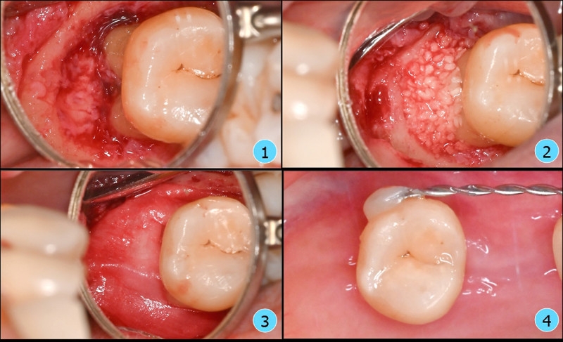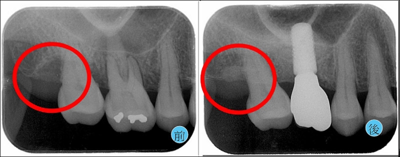 4.若條件允許,能在缺損處置入再生材料,期待將失去的骨質與牙根附著能再生(圖1)。