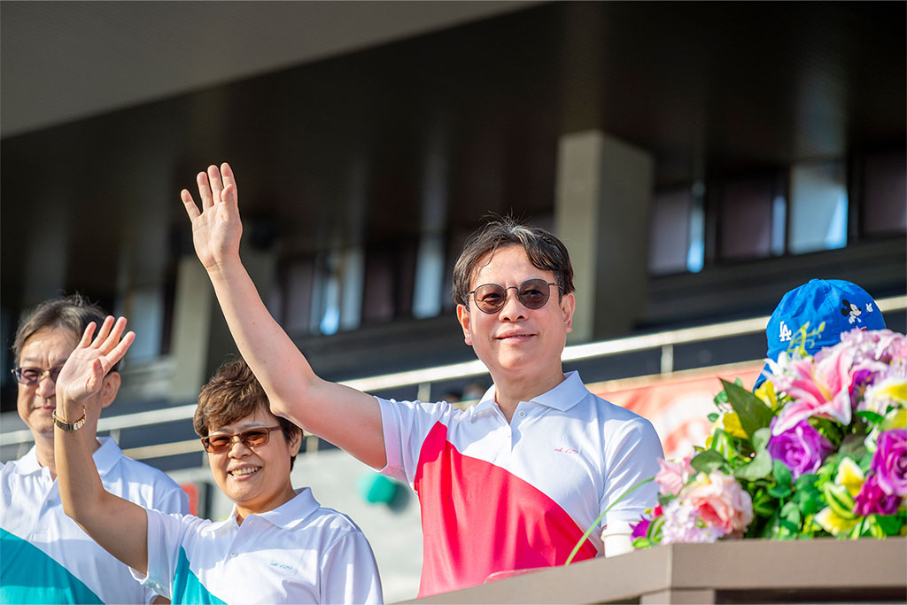 陳穆寬總院長(中)在運動大會現場,為員工加油打氣。