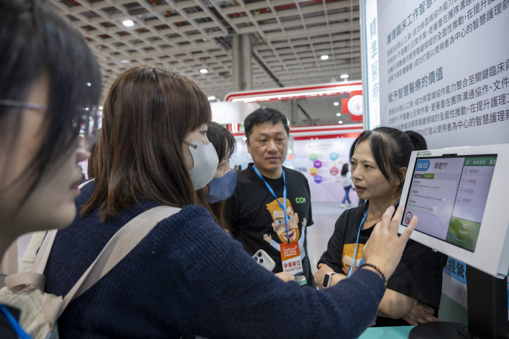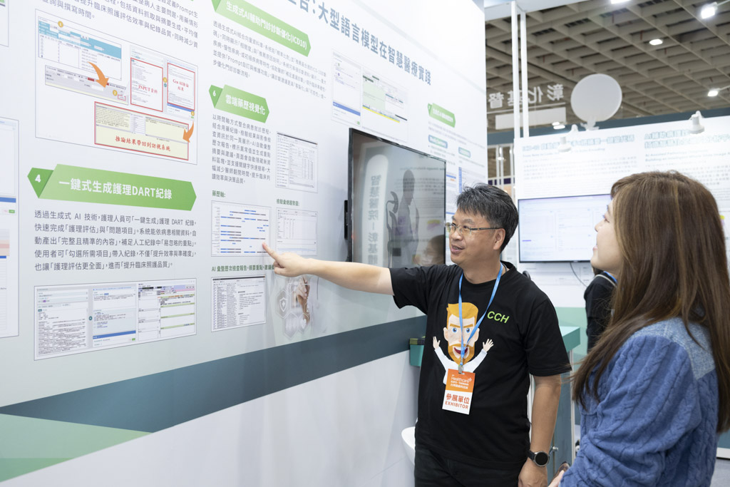 展場攤位以中風中心與資訊部共同開發的個管協作平台與「蘭醫師 LineBot」輔助服務,以及 AI 智能眼鏡與智慧病房床邊照護系統,展示科技如何優化治療流程與提升照護品質。