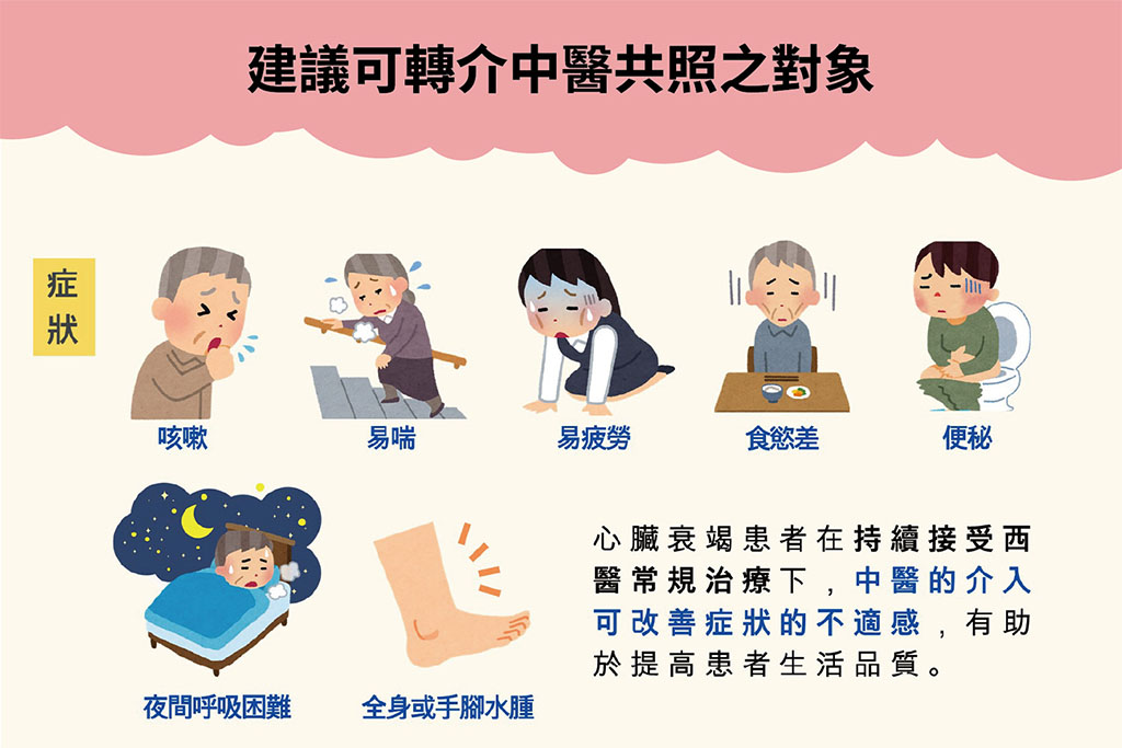 心衰竭患者常伴隨多種不適症狀,除需由心臟內科進行長期評估與治療外,亦可考慮接受中醫輔助治療,協助改善症狀不適,提升生活品質。