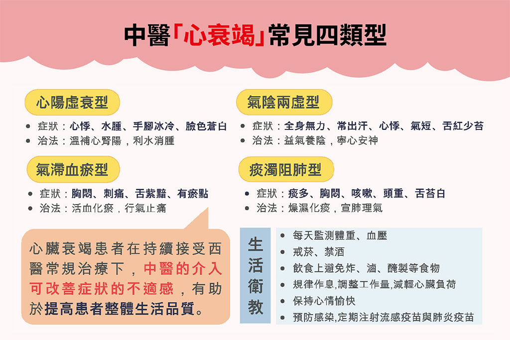 中醫部副主任陳運泰醫師說明,中醫在心衰竭治療中扮演的是優化治療效果的角色,重點在於整體調理與支持身體功能,例如提升體力、改善疲勞與呼吸困難,協助患者在長期治療中維持較佳生活狀態。近年也已有國際研究證實,在標準西醫治療基礎上加入中醫藥輔助,能降低心衰竭惡化住院或心血管死亡風險,且具良好安全性,顯示中西醫整合在心衰竭照護上有一定的價值。中醫將心衰竭常見證型歸納如下:心陽虛衰型、氣陰兩虛型、氣滯血瘀型、痰濁阻肺型。中醫藥治療強調整體觀與辨證論治,依不同體質與症候型態,提供個別化調理方案,作為現代醫療的重要輔助。多項研究也支持將八段錦或太極拳等傳統養生運動納入心衰竭病人的心肺訓練計畫中。這類溫和的養生運動有助改善呼吸困難、肌耐力與心理狀態,非常適合慢性心衰竭病人長期練習,是極佳的自我保養方式。