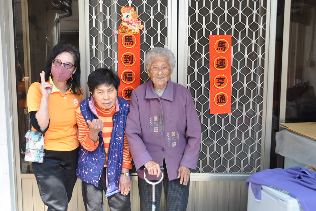 詹執行長(左)陪伴彩姨(中)與婆婆(右)懸掛春聯,提前迎新春。