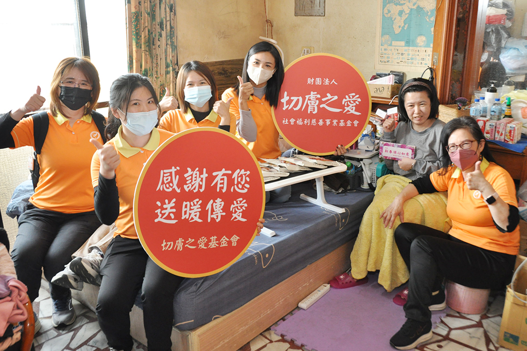 切膚之愛基金會攜愛心物資,關懷彩姨(右一)及其婆婆(右三)。