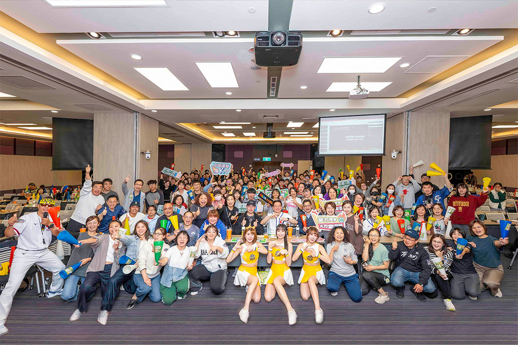 彰基培訓中心直播現場座無虛席,全體同仁與啦啦隊、主持人開心大合照,共同紀錄這場難忘的應援盛事。