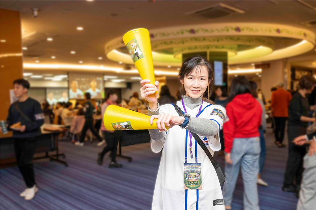 彰基人資處長江季蓉手持加油棒參與活動。她表示,希望透過球賽直播讓高壓的醫療人員在繁忙之餘能適度放鬆紓壓。
