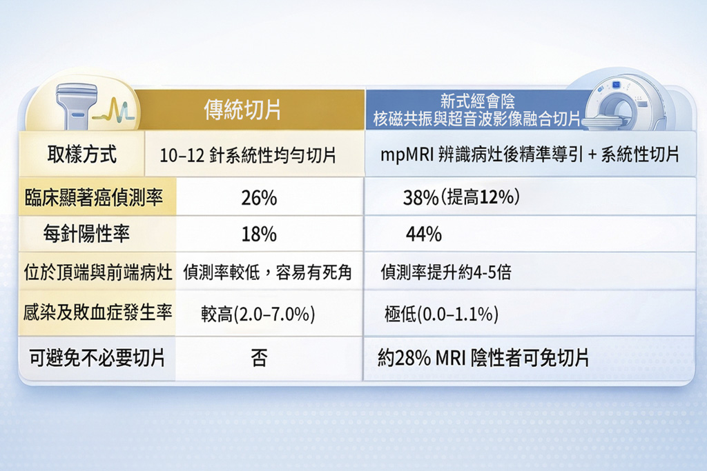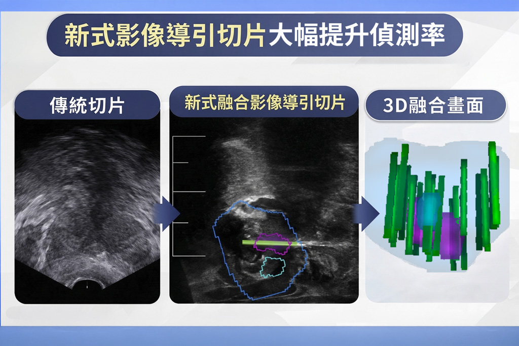 攝護腺癌早期無症狀,傳統切片恐有偽陰性;MRI融合影像導引切片可精準取樣,大幅提升偵測率。