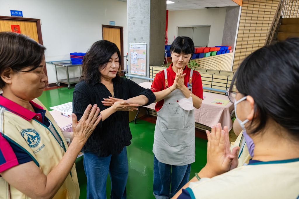 張麗柔董事(中)透過精油香氣為身邊夥伴手掌畫愛心,傳達「為愛行動,因愛富足」理念。