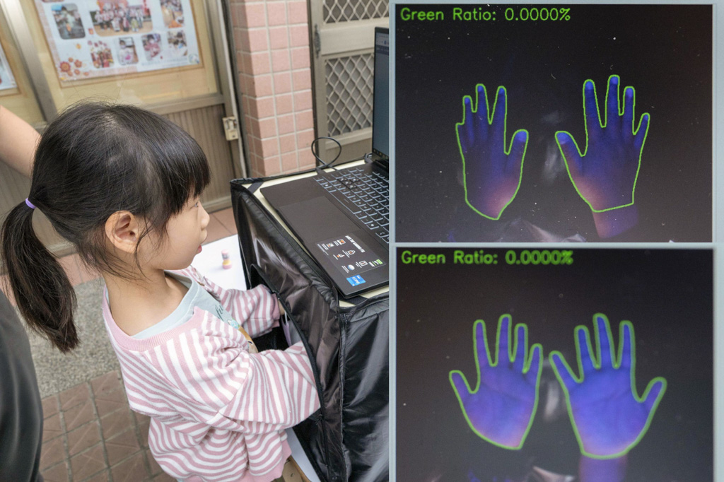 兒童將手伸入檢測箱,透過智能手部衛生評估教具,找出沒洗乾淨的盲點。