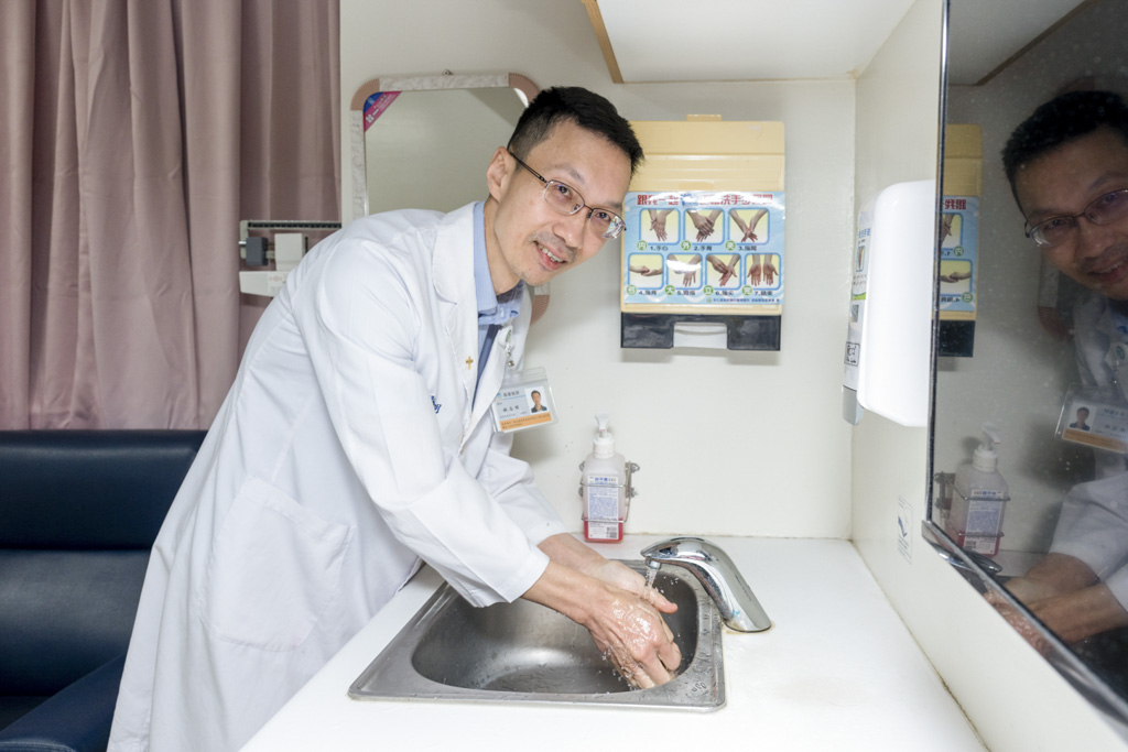 彰基創新育成研發中心主任林志明醫師示範洗手,強調將醫護訓練系統轉化為兒童版虛擬助教,能精準鎖定指尖、指縫等容易忽略的清潔盲點。