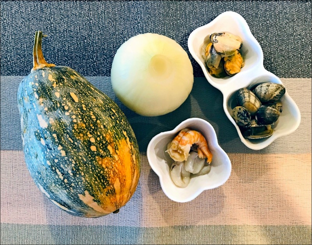 ● 食材:南瓜(帶皮)200克、草蝦100克、蛤蜊100克、洋蔥30克、低脂鮮奶240毫升、南瓜籽10克、橄欖油1/2茶匙、鹽及胡椒適量。