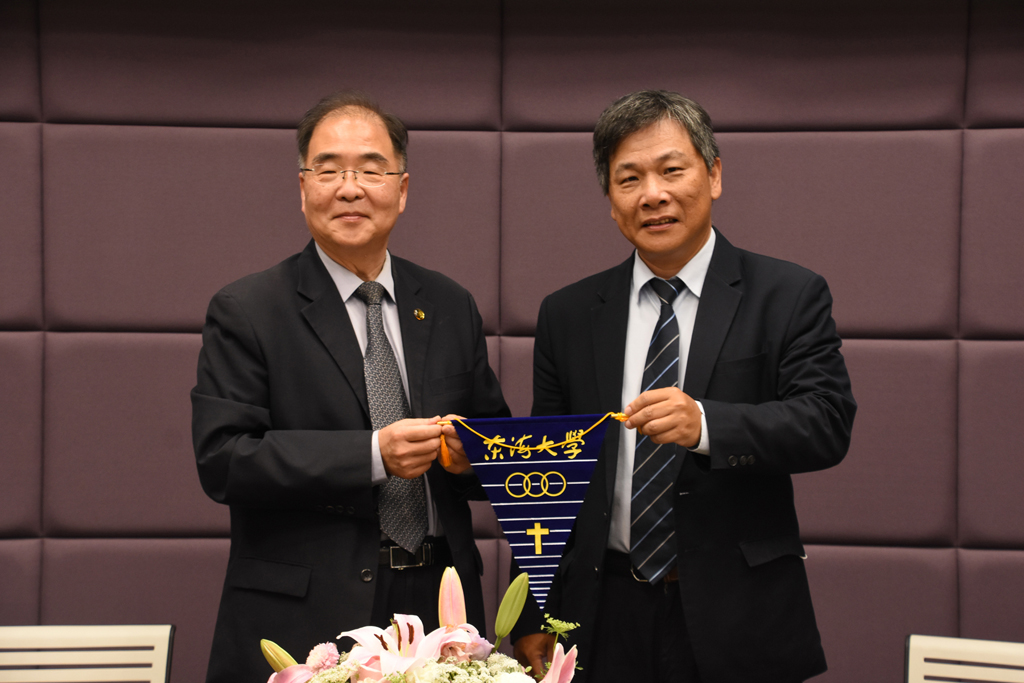 東海副校長王立志教授(左)致贈校旗,彰基副院長林慶雄醫師(右)代表彰基接受。