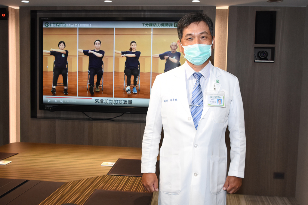 新冠肺炎疫情嚴峻且第三級警戒延長,許多長者無法外出活動,彰化基督教醫院胸腔內科特別與健身老師共同設計4組7分鐘「活力健肺操」,讓肺阻塞病人在家只要一把堅固的椅子、一小空間就可持續斷練肺活量,彰化基督教醫院院長暨臺灣耳鼻喉頭頸外科醫學會理事長陳穆寬教授表示,7分鐘「活力健肺操」對肺復原很有幫助,將安排住院中行動自如的隔離病患,於固定時間運動健肺。