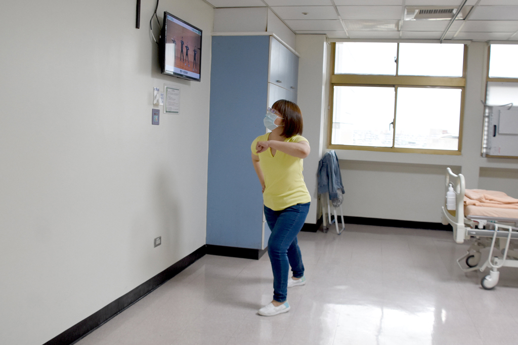 彰基收治COVID-19隔離病患,患者於隔離期間也需要運動健肺、正念抒壓,所以除了由院牧部關懷師、牧師,每日以電話關心患者心靈需求之外,也規劃每日固定時段運動,讓病患身心靈都受到照顧。