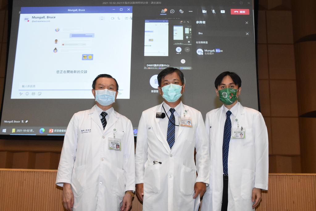 彰基醫學中心舉辦 「2021年臨床試驗國際研討會」,以遠距視訊與實體併行方式進行。(圖中:彰基副院長林慶雄醫師、圖左:彰基臨床試驗中心主任林進清醫師、圖右:彰基臨床試驗中心副主任林聖皓醫師)