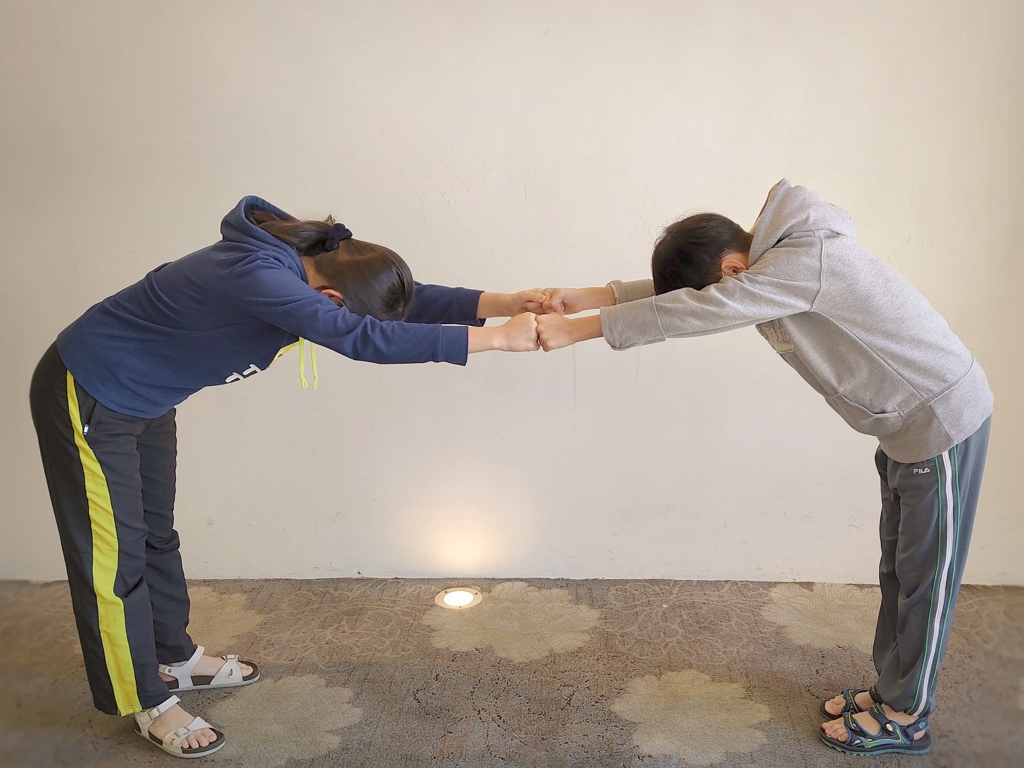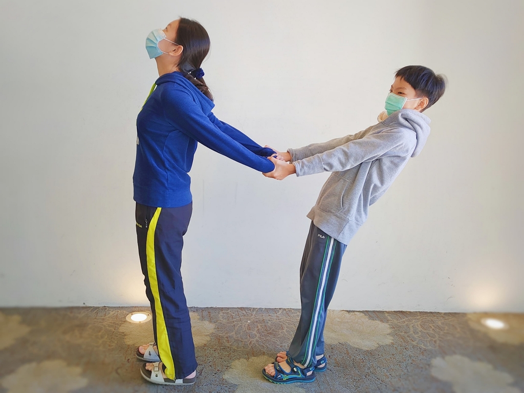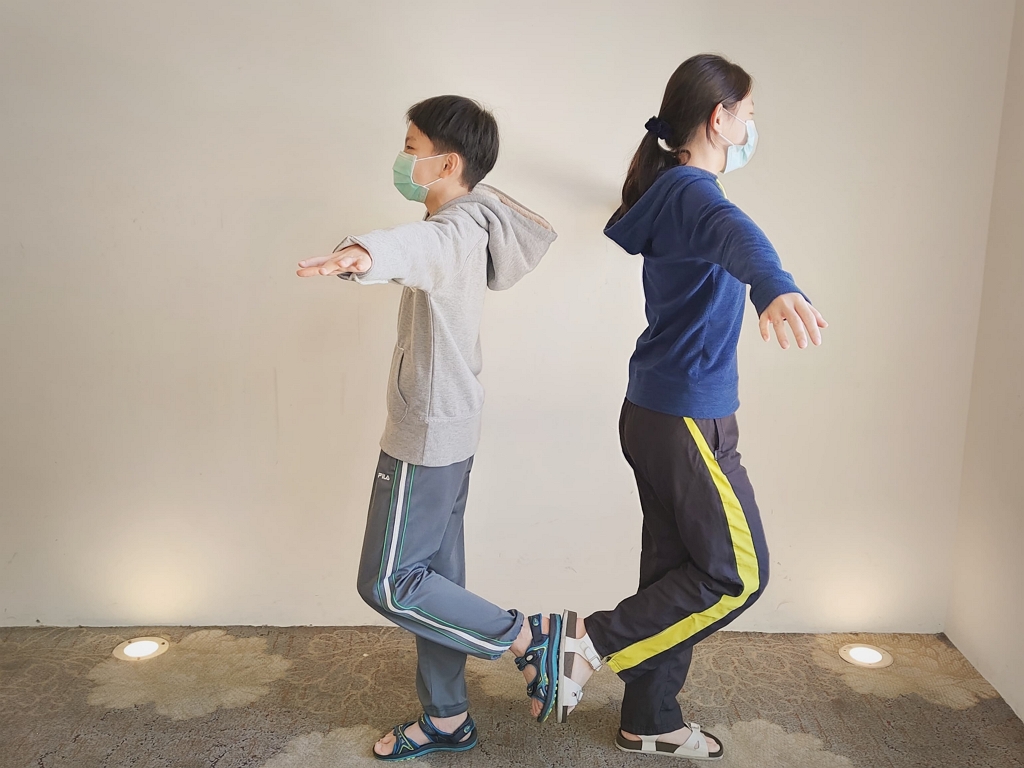 雙人背對背,單腳金雞獨立但腳心相向,玩雙人反向金雞獨立。可以訓練雙腳力量,還可以互相挑戰,看誰的耐力比較好,提升運動的樂趣!