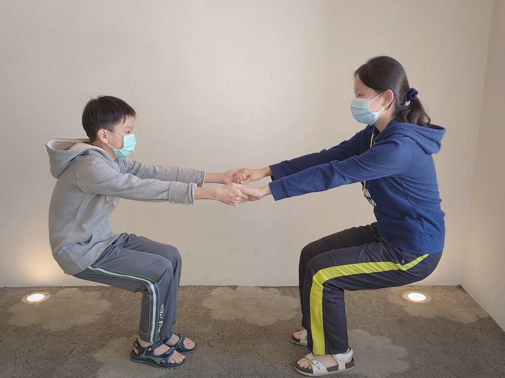 面對面,雙手互扣,臀部慢慢向後向下蹲,可增加之間的默契,還可以訓練大腿、骨盆、腹部核心肌肉群等。